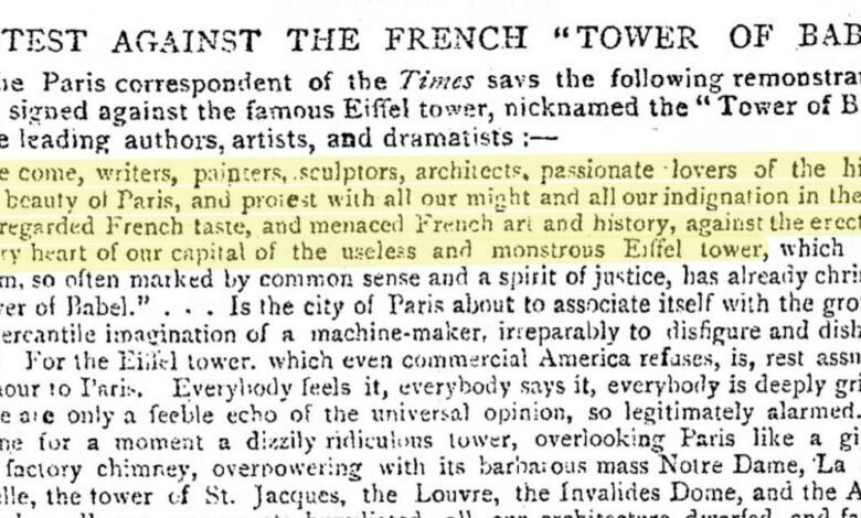 …بعد شهر من بدء البناء في عام 1887، نشرت مجموعة من الفنانين الفرنسيين البارزين رسالة مفتوحة بعنوان “فنانون ضد برج إيفل“ظهر على الصفحة الأولى لجريدة باريسية”الأوقات.’